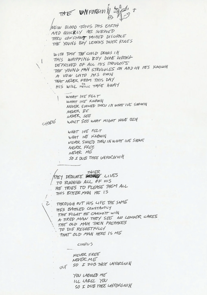 In essence, Verse 1 of “The Unforgiven” establishes a poignant narrative of a young life marred by societal pressures, injustice, and the internal struggle for autonomy. The lyrical depth and storytelling prowess contribute to the song’s resonance, inviting listeners to empathize with the protagonist’s journey of self-discovery and defiance.